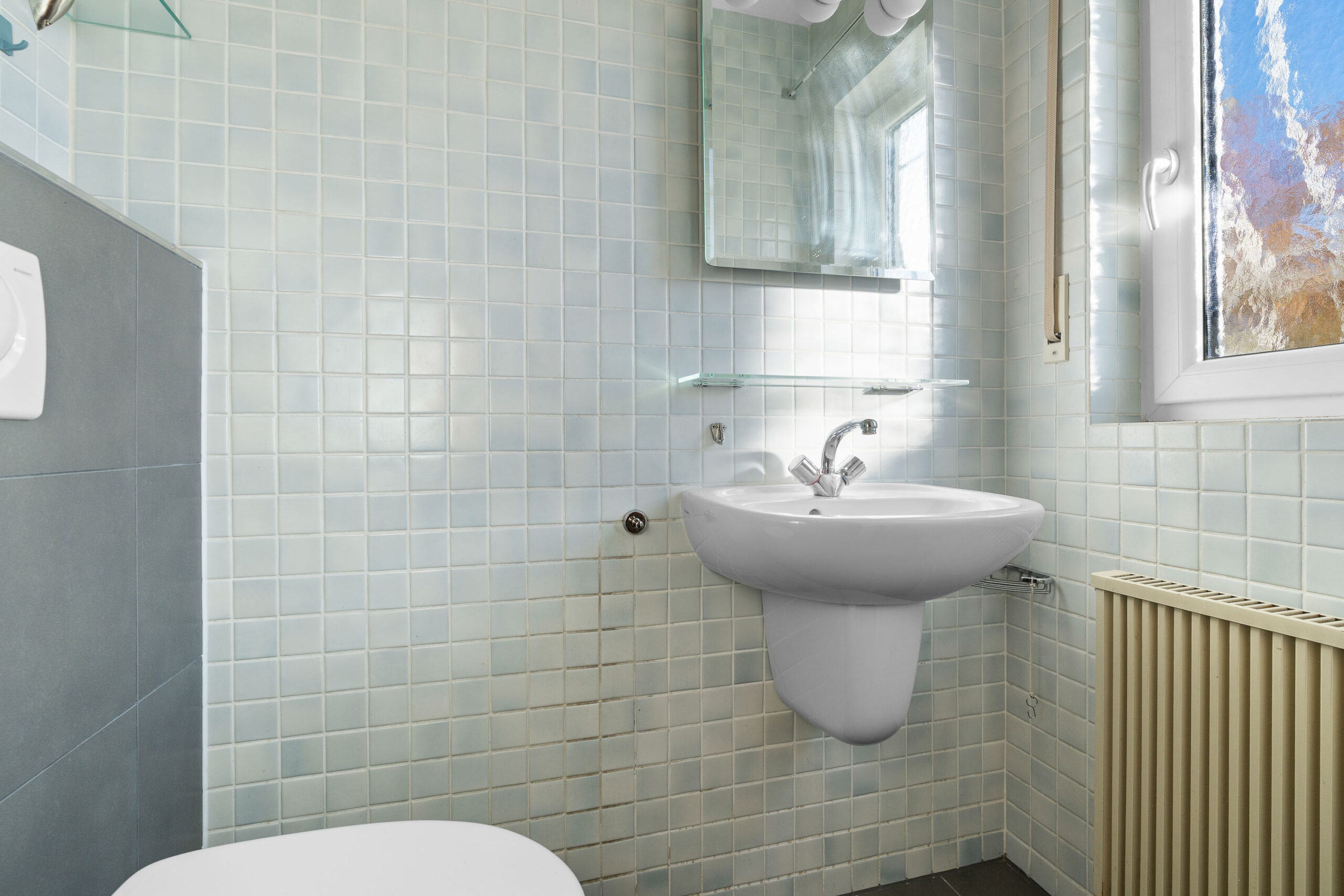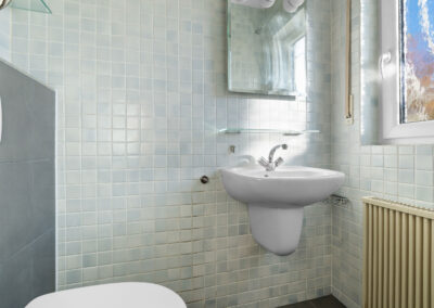 Im Inneren stehen zwei Vollbäder – jeweils im ersten und zweiten Obergeschoss – sowie ein separates Gäste-WC im Erdgeschoss zur Verfügung. Die Räume sind größtenteils mit dreifach verglasten Kunststofffenstern ausgestattet; lediglich im Kellerbereich und bei den Dachflächenfenstern wurden einfachere Ausführungen verwendet. Ebenso verfügen die Fenster in fast allen Wohnbereichen über Rollläden.